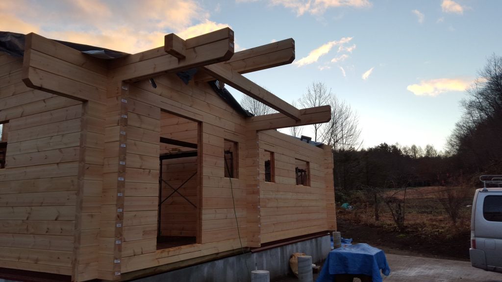 嬬恋村K邸様では私は参加していませんが、職人さん頑張っていただいております。 チーム高原メンバー、山中さん、八坂さん、フサユキ大工、コンペーさんの少人数メンバーでの建て方! 昨日ログが組みあがり、今日は垂木かけ作業です。 来週中には雨仕舞いができるでしょう!