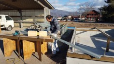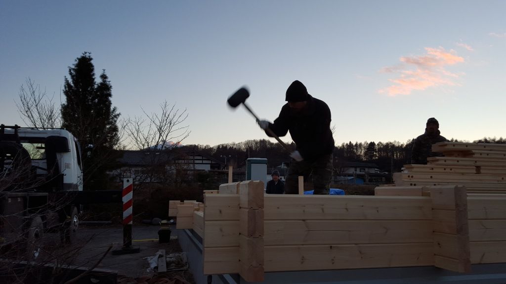 昨日からY君邸建て方工事が本格的に始まりました。 土台は先日マーモンがこなしていたので朝一番は、イかす屋根屋の西山さんが土台板金作業にきてれました。 軽井沢、北軽井沢エリアのログメーカーはほどんど西山さんが葺いているといっても過言ではないでしょう!! 私が困っていると忙しくても「お~、ノブなんとかするぞ~」といってくれそつなく作業こなしてくれます! 今年も忙しそうですが頼りにしてますよ~!!