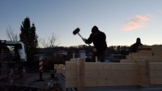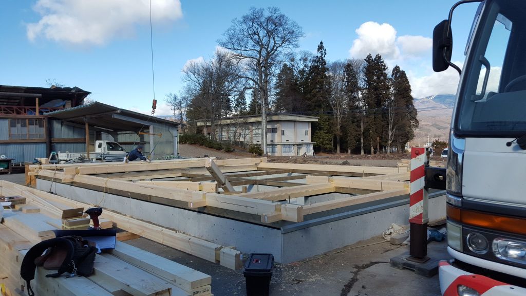 仕事は1.2段のログを基礎部分にアンカーでしっかり固定していきます。 それから1F根太作業。45×145mmの材料を455mmピッチでとめていきます。 午後3時に根太上に仮床をおいてステージを作成しました。