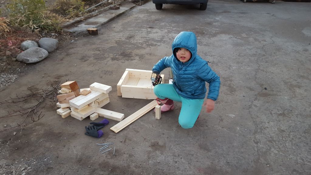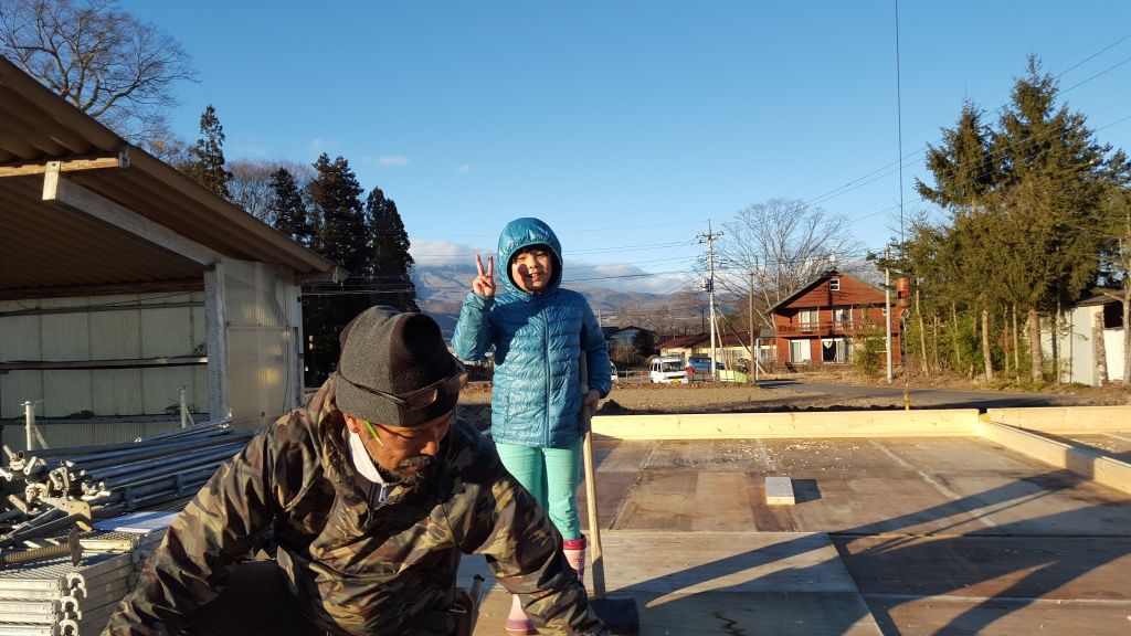 ちびっ子大工、Y君の娘と4時ごろ仕事から帰ってきたY君もログ積みに参加しました。かけやをふっている姿が格好いいですね~! 娘は破材で家作り。 インパクトを上手にこなして!!いるかな~!?(笑)