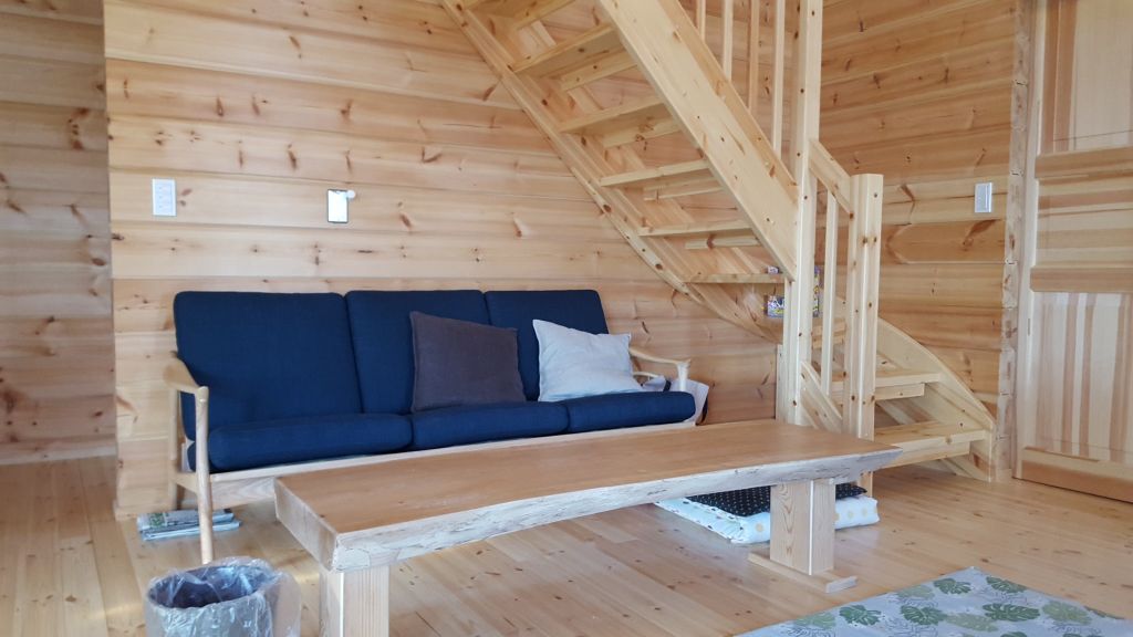 M様は住んで2か月がたち生活感がでてきました。 家具等もお客様の色がでる部分ですね~。 ひときわ目を引いたのがソファーですよ。 格好いい北欧のビンテージソファーです。 フレームの曲線とシャープな感じがいいですね~。 こちらのソファーは前橋のRETORO BOXさんという家具屋さんから入手したそうです。 家具ひとつでイメージが本当に変わりますね。 ログハウスの住み心地は快適だそうです。喜んでいただけてるようで良かったですよ!!