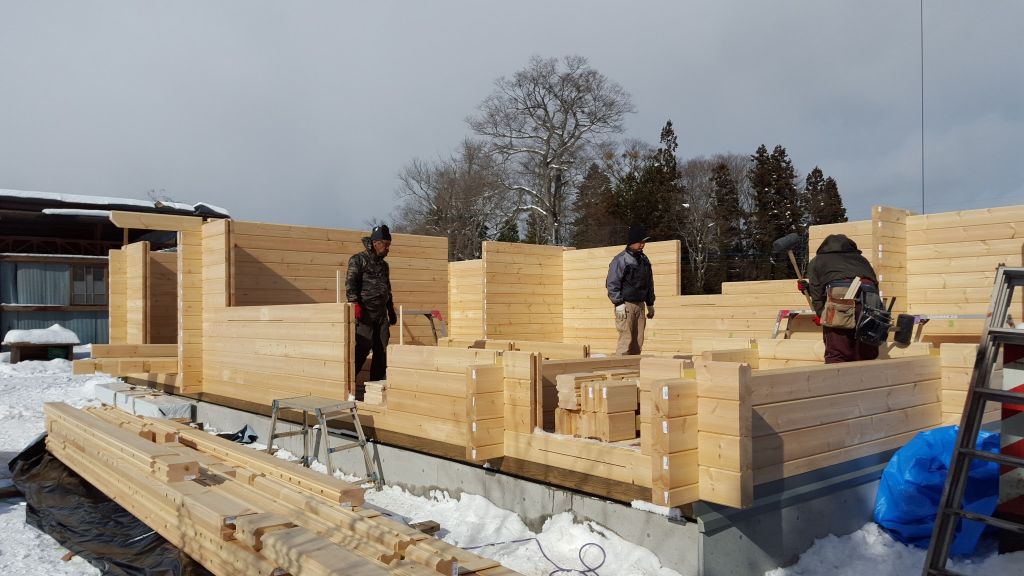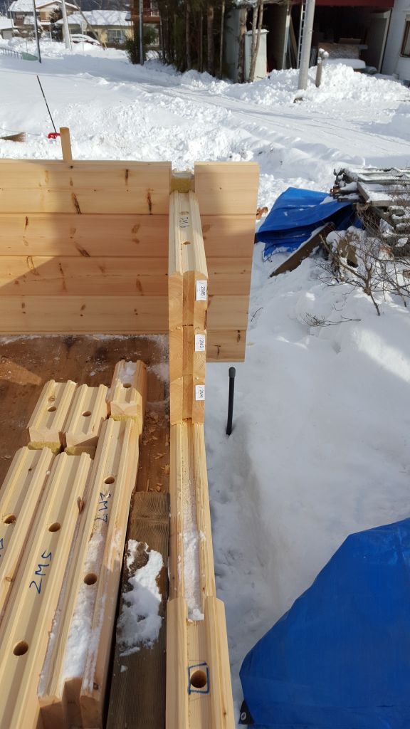 朝の時点でログ3段でしたが5時にはログ17段まで積み上げることができましたよ。午前中は12段まで、午後は室内側にビデ足場を組み積み上げていきます。 ログのつなぎはなく、弊社ログキットは最長12mまで加工できますので、1本が12m以下ですので10mの材料も長尺材で積み上げられていきます。 たまに加工ミスがありますが、何もなければかなりのペースで積み上げることができるんですね!!