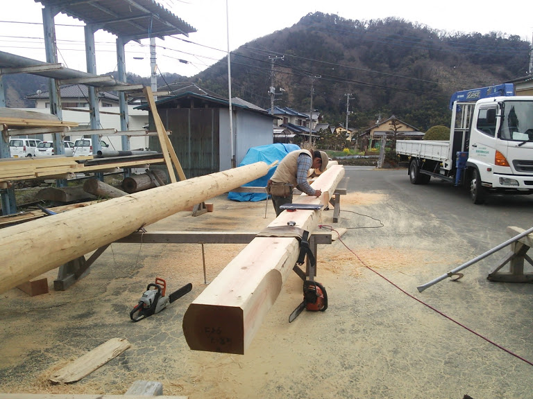 一昨日の午後から訪れたのですが、加工サイトでは迫力ある丸太が刻まれていました。私はただ見学するだけではなく管柱のホゾをつくる作業をノルマで与えられましたのでお仕事させていただきましたよ。