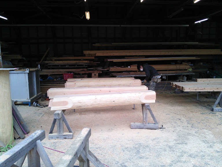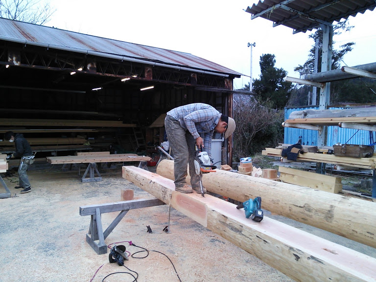 加工は吉井さんの仲間で刻んでいます。 仲間の一人は伊豆の国市で建築全般ポスト&ビームをてがけている丸太工房 秀の塩谷さん。 地元でログビルダーの鈴木さんの3人で刻んでいます。
