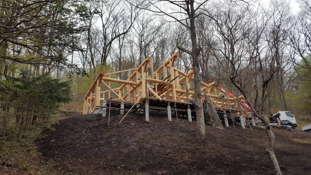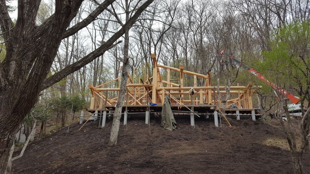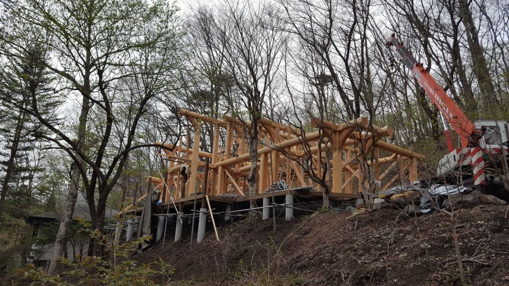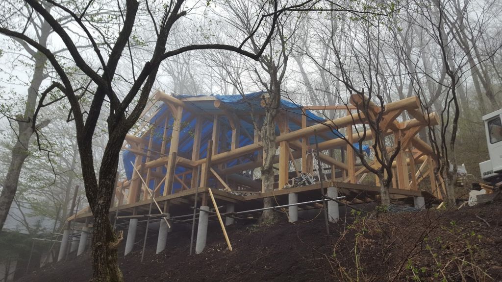 軽井沢にて建築中のY邸様ポスト&ビームが上棟となりました。 迫力ある丸太の棟、母屋がのると一層格好よくなりました。 登り梁の角度のついた仕口のおさまりも完璧で加工した吉井さんもホッとしたのではないでしょうか。 ポスト&ビームの壁がないときの構造はホント格好いいと思います。 壁があると丸太があまりみえてこないので今の状態が私の中では一番格好いいかな~なんて。