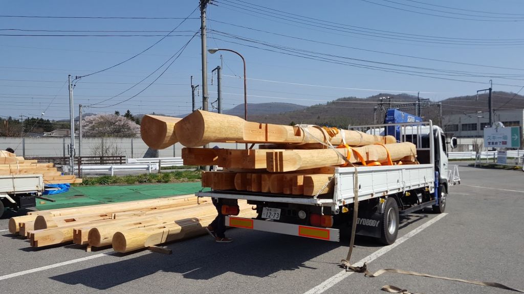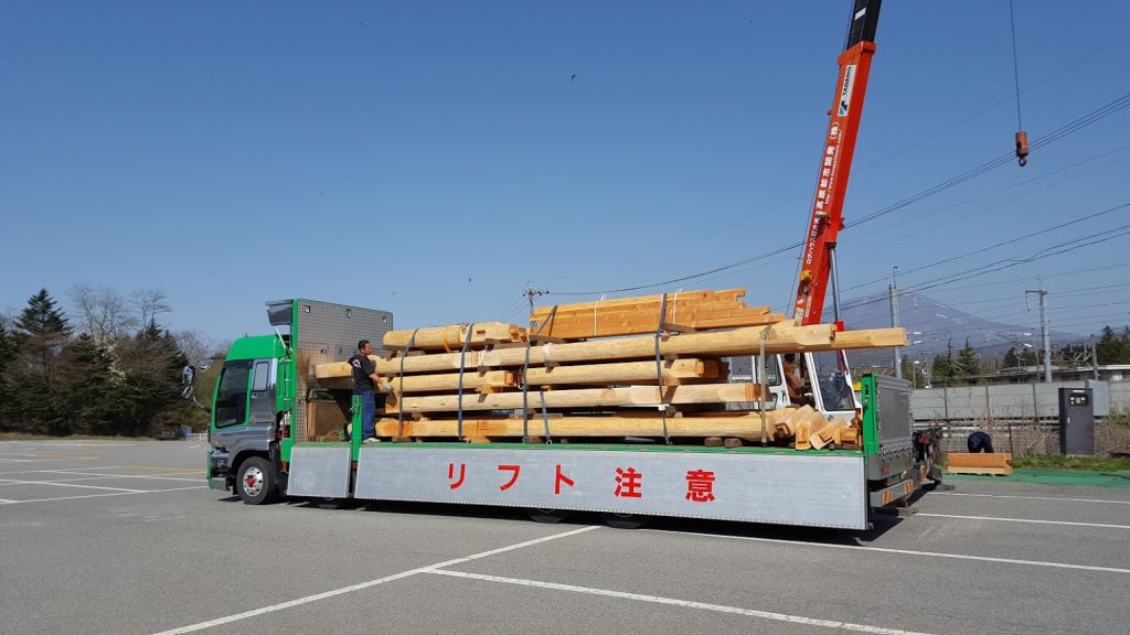 軽井沢Y邸様の建て方が本格的に昨日から始まりました。 現場近くの軽井沢プリンスホテルスキー場の駐車場を借りることができて朝一で一昨日伊豆にて積み込んだポスト&ビームのキットが到着しました。 刻みを依頼したリーフの吉井さんにも伊豆から来ていただきましたよ。 1時間ほどで大型トラックからキットを荷下ろしして弊社ユニックにて現場まで搬送。 弊社クレーンを現場に設置して建て方の開始です。