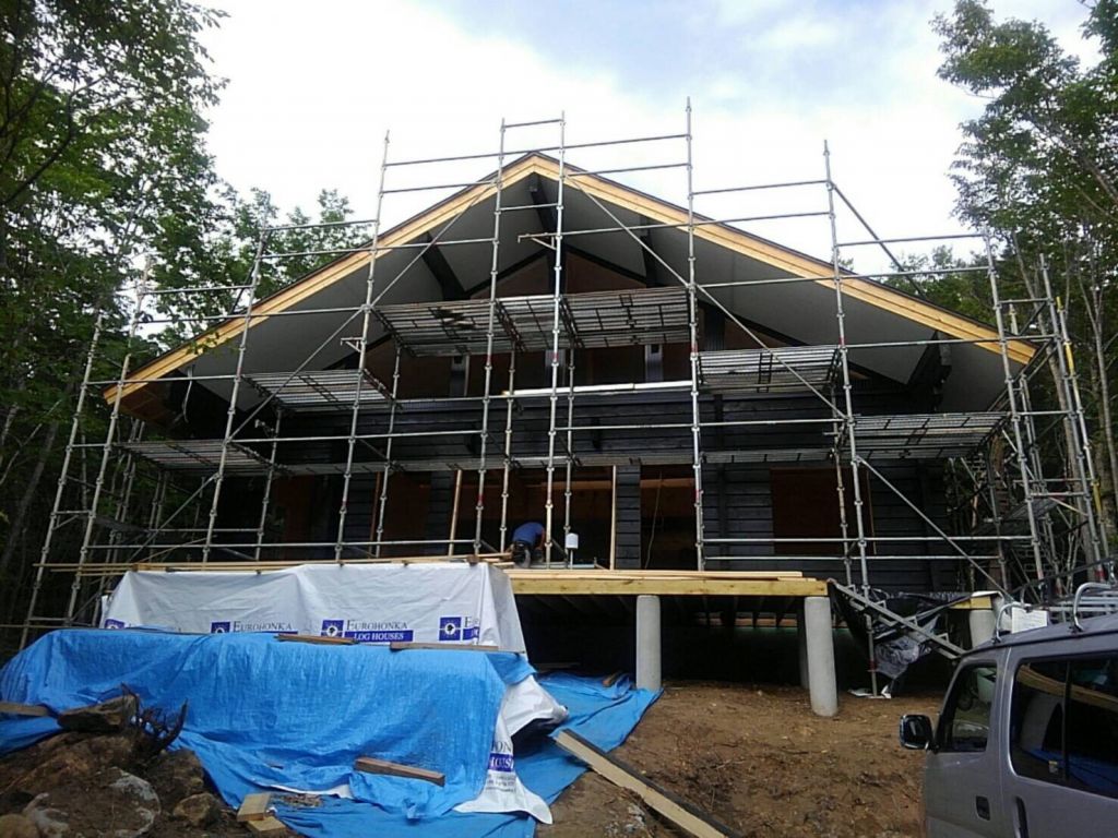 2階はガルバサイディング、軒裏もガルバサイディング、破風はガルバ鋼板巻なのでメンテナンスの再塗装は1階のログ壁を塗装するだけでOK。 脚立をたてて塗装できるので足場をかけない分メンテナンスも軽減できますね。