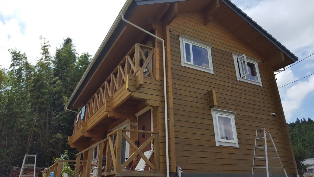 コーキングしてから折角なので雨がよくかかり、陽と紫外線もかかる東側をお客様と一緒に塗装させてもらいました。 高い場所は私のほうで、低い場所はお客様に塗装いただきましたよ。 紫外線と雨がよくあたる場所はこまめに塗装しないとダメですね。 塗料のキシラデコールは塗装が伸びないでどんどん壁に吸収されていきます。通常塗る3倍の塗料をしっかりしみこませ塗装完了しました。 総2階なので妻の部分は高いので塗れなかったのでツートンになってしまいましたが次回再塗装時に塗装しましょう!!