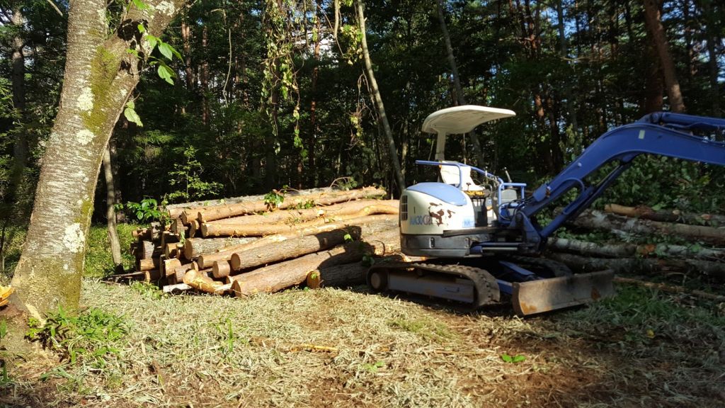 昨日は茅野市K邸様伐採工事に行ってきました。 伐採スタッフは高原都市開発の最強シルバー人材の安斎さん、朝雄さん、和一さんです。 朝7時に倉庫で待ち合わせて私が運転手でいってきました。 現場9時到着で伐採工事開始。 伐採本数は約15本でほとんどがかなり大きな木でした。 朝雄さんが次々とめがけた方向に倒していき、和一さんが4mの長さに玉切り、枝の切り落とし、安斎さんがユンボで枝と玉切りした木をまとめる役目でしたが、仕事がなんせ早い!! 私はほどんど切り落とした枝をまとめているだけでしたよ。