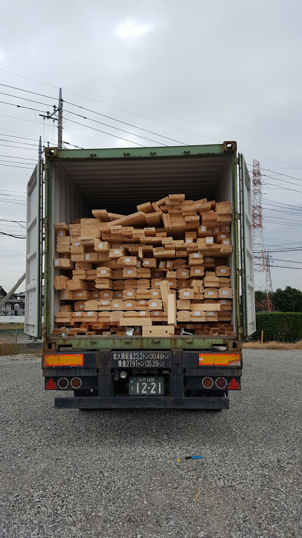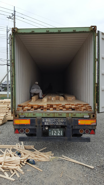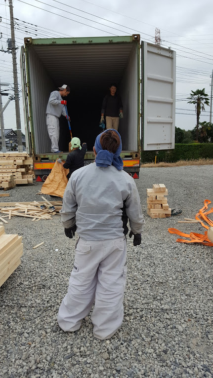 コンテナをOPENしていざ作業! 気合をいれてのぞんだのですが、さすがD型ログは量がありますね。 見たとたん心が折れそうになりましたが、皆で頑張りましたよ! 3時には無事荷下しできました。