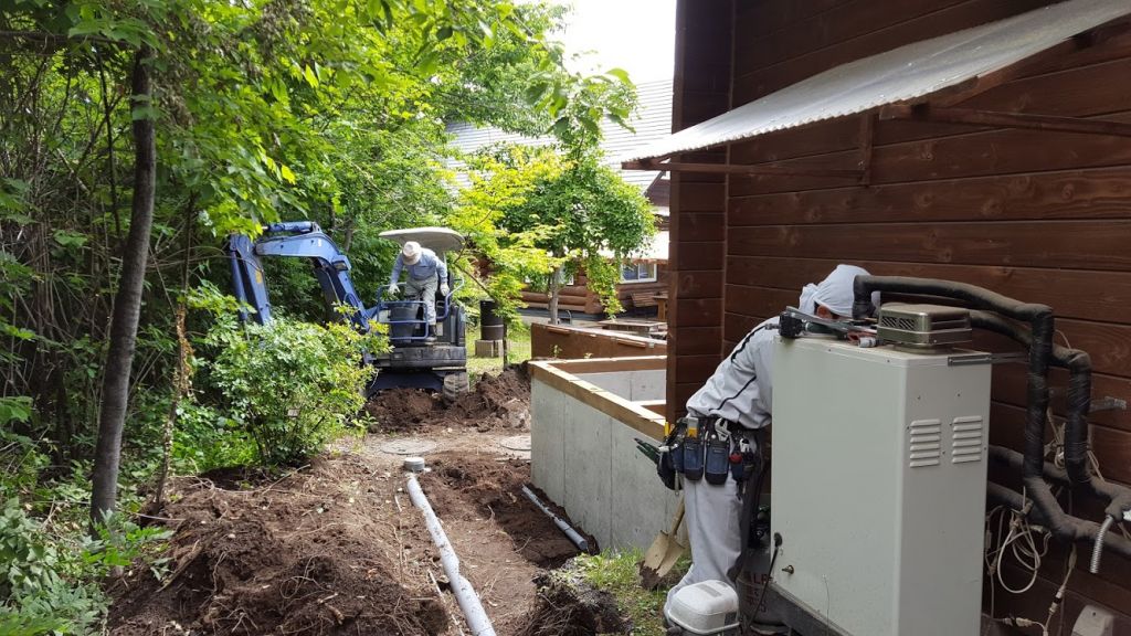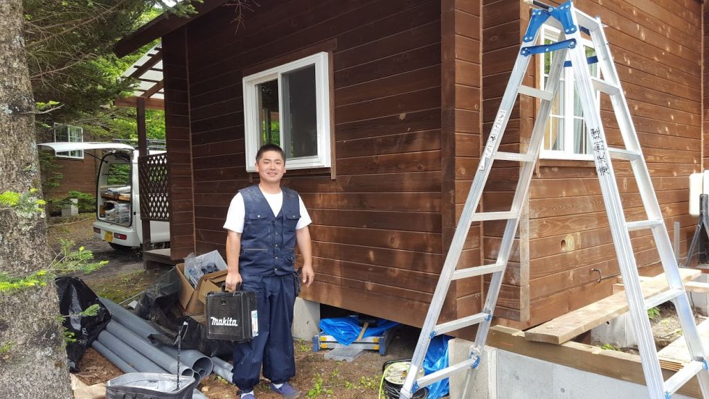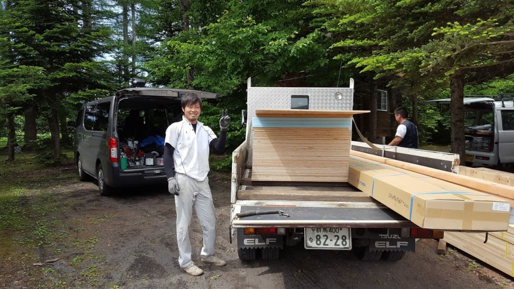 さてお仕事の話ですが、只今嬬恋村のろぐっコテージ「フリータイム」の増築工事を手掛けさせていただいております。 昨年1棟工事させていただいて今回2棟目になりますよ。 基礎工事は完了しまして昨日は埋め戻し作業、大工さんによる土台施工、水道配管工事が工事されてました。 北軽ランバーの干川ちゃんが材料を現場に運びいれていましたよ。 ビス一本いやな顔せず持ってきてくれる干川ちゃんのピースサイン! 真面目な大工さんで滝沢大工ことタッキーも一枚パシリ!!。