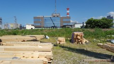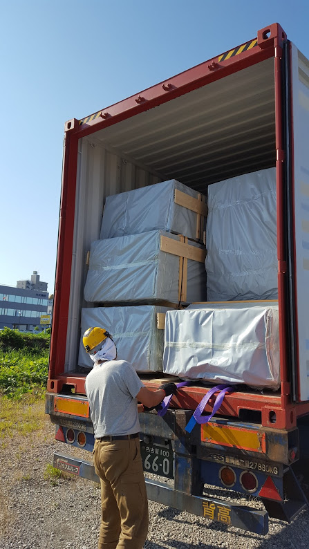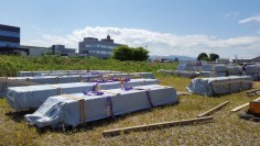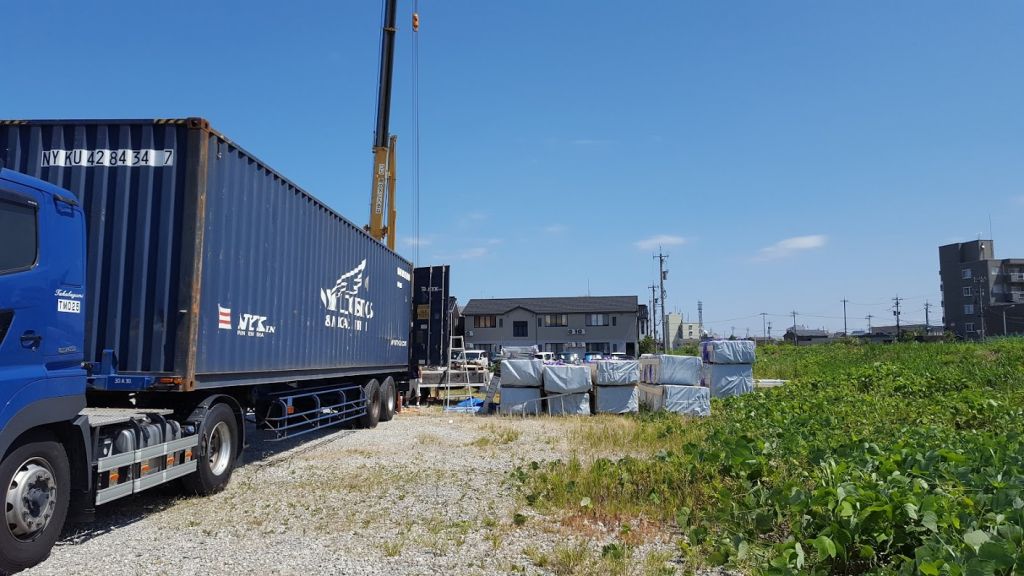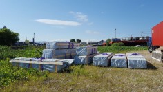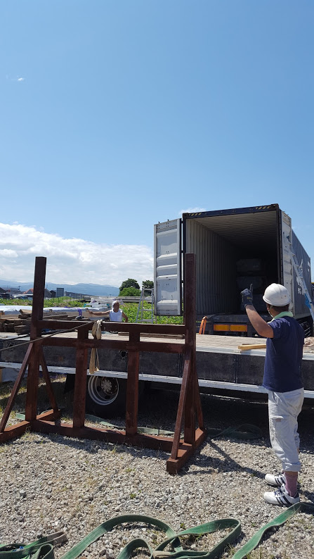 20日はコンテナが2台エストニアからやってきました。 荷下ろしは順調で10時半には材料を下ろし終えましたよ。 それから材料の仕分け作業です。段数ごとに分けながら気密テープをはりこんでいきました。