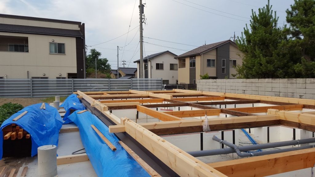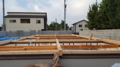 昨日は現場と荷下ろし場所に分かれての作業です。 現場では土台を据えて1段目まで積み上げました。 大引きの作業も完了です。