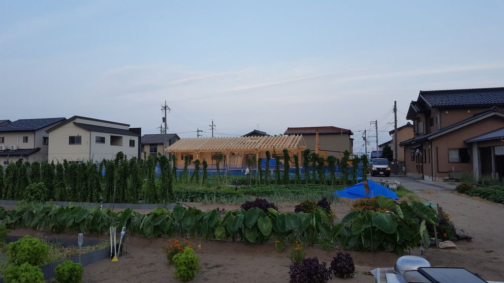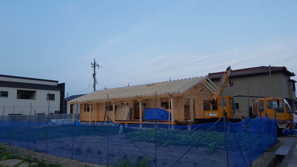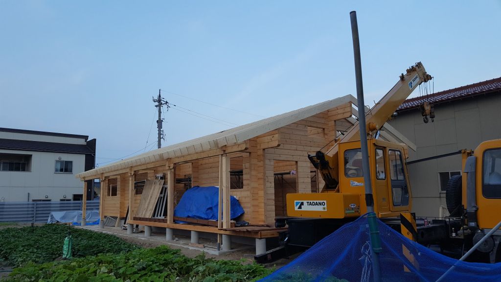 ここ連日暑い日が続いています。 金沢出張中です。雨にて2日間お仕事できませんでしたが昨日垂木がかかり家の形になりましたよ! 平屋といってもログ段数21段! 天井高があり開放的な空間になっていますよ!