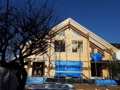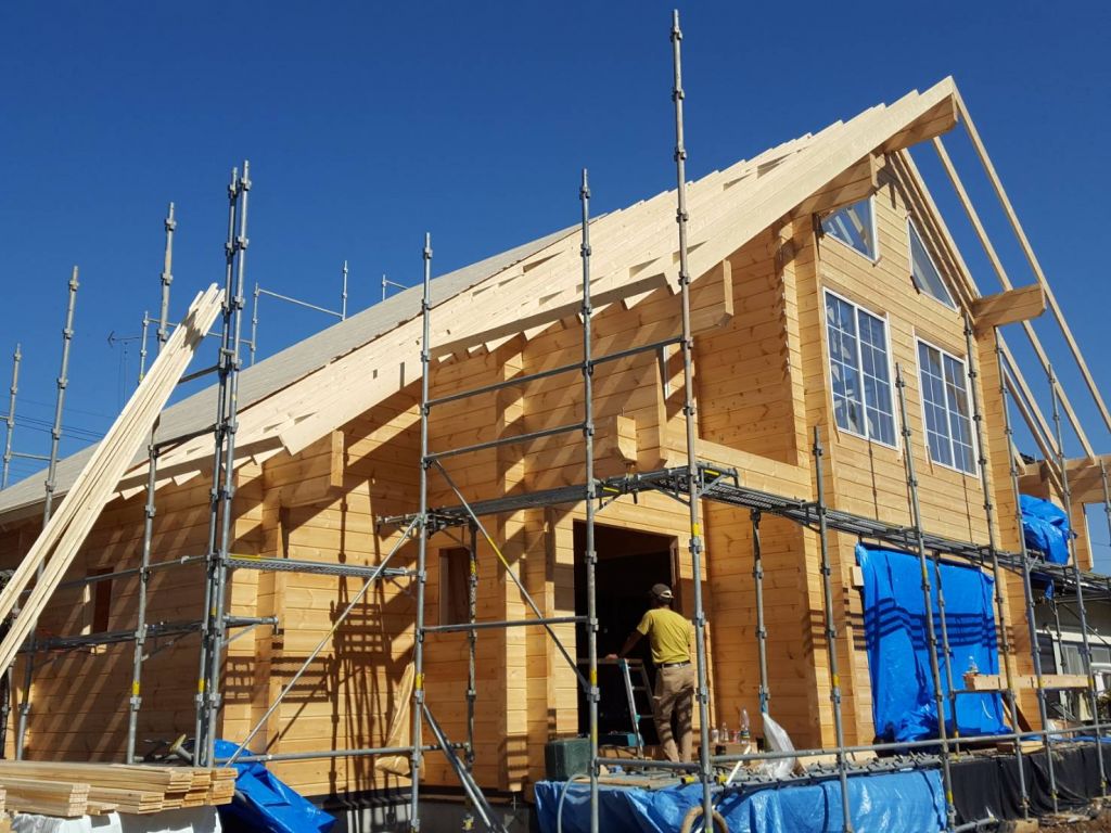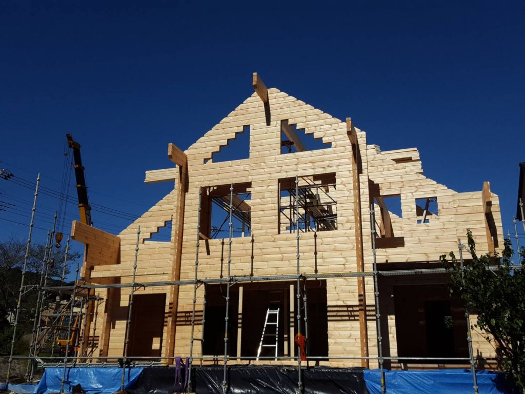 台風21号の長雨の合間を見ながらの作業でしたが、埼玉県の越生町の建築面積176㎡(53坪)の大型住宅のビルドアップも要約形になってきました。今日は素晴らしい青空、台風22号の影響がでないうちに野地板、破風板やら屋根下地まで工事が進むように、事務所で激をとばしています。ログハウスの住宅に夢を描いている方、興味のある方は場所も分かりやすい所なので足を運んでみてください。イケメンの大工さんが造作作業をしています。