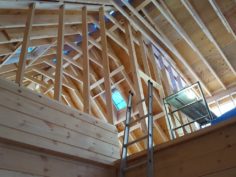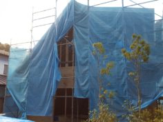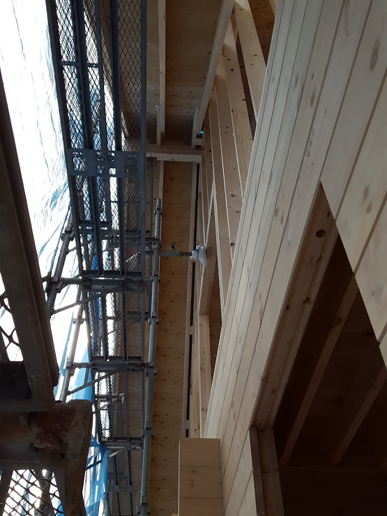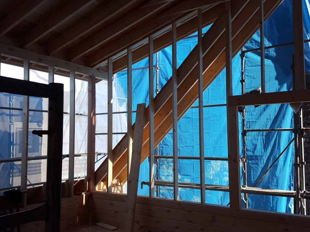 水曜日にクレーンを手配してあっという間に棟上げから垂木掛けをしました。 木曜日は雨でしたがシートをかけて天窓や煙突下地施工、金曜日に野地板施工、破風板施工、昨日土曜日は妻壁、ドーマ壁の下地施工をさせていただきました。