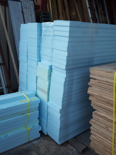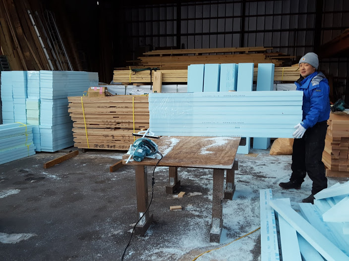 来週からは事務所より少し浅間山よりの別荘地にて企業の保養所新築工事をスキャンDホームにて建築します。 標高1200㎜の朝晩は-15℃ぐらいまで冷え込む場所で工事が大変ですが来週から頑張りますよ。 倉庫では弟のマサヤと山崎さんが床組みの段取りをしていました。 50㎜のスタイロ加工と1F床の下地加工していましたよ。