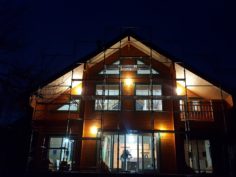 本日の作業は2月頭に足場を解体する予定のため外回りの照明器具やベンドキャップ工事、コーキング工事をしてきました。 外部の照明器具は全部で12か所です。 ほぼすべてがお客様チョイスのマリンランプです。ログハウスにはマリンランプが似合いますね。 夕方暗くなったので取り付けたマリンランプをテストをかねて点灯させてみました。 いいですね~、 雰囲気でてますね~。 私は照明器具が取り付けられ電気がつくとこの仕事の中でも嬉し楽しい気分になります。 今日の仕事は楽しませていただきましたよ!