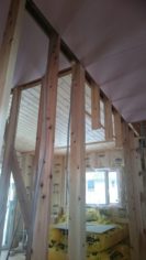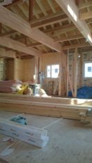 天井や壁の板貼りになります。熟練された大工さんが貼っていますよ~! 2梱包入れてあるログパネルもあっという間に1梱包が終わりそうな勢いです(^^;)