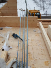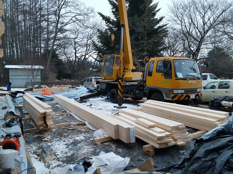 お仕事ですが、安曇野市N邸様現場はログ組が終わり小屋組みの段取りをしております。 棟木と桁に垂木の墨をつけて垂木の勾配カットや、柱施工、私は通しボルト施工が終えました。 今日は棟木をかけて垂木をかけられる工事になると思います。