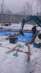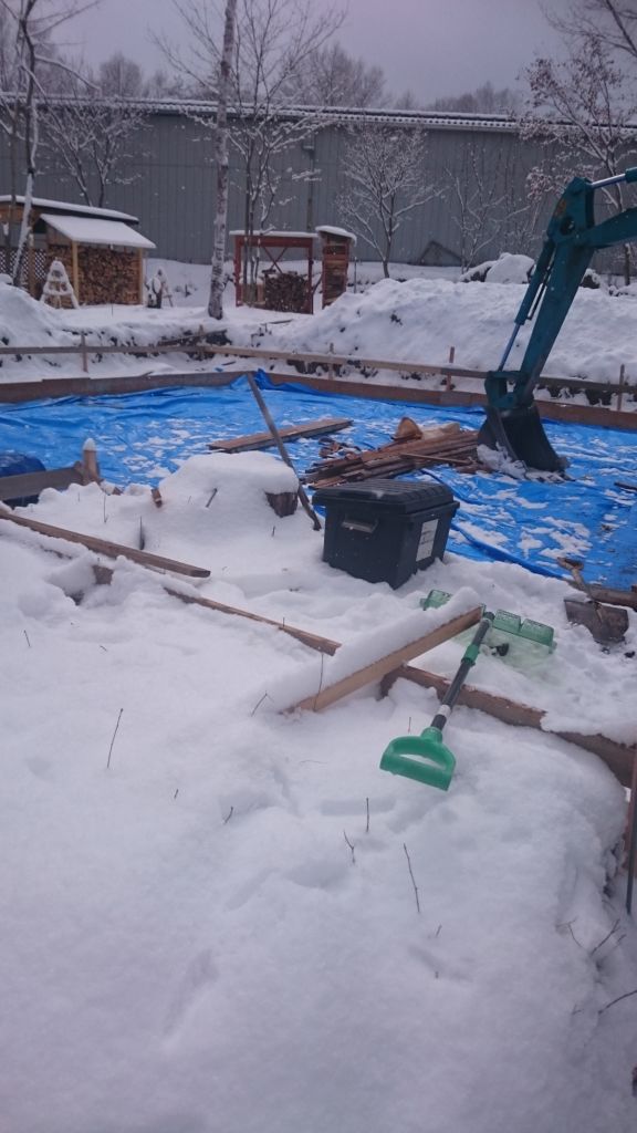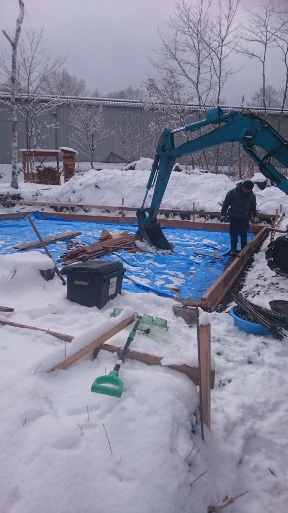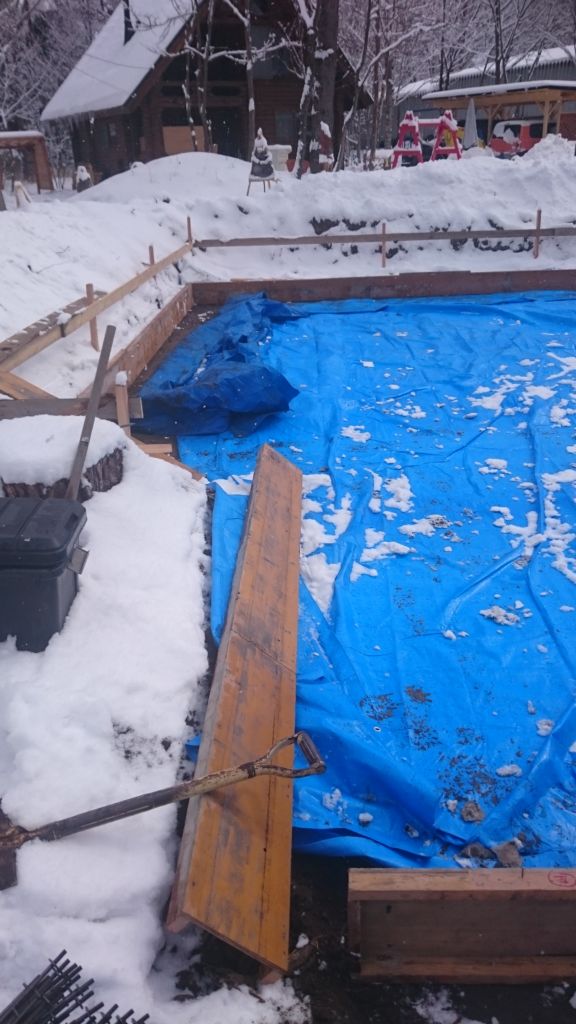 嬬恋村I様邸では基礎工事が始まり、安斉さんがベースの型枠を段取りしていました。雪も降っているのでブルーシートを敷きながらの作業です。