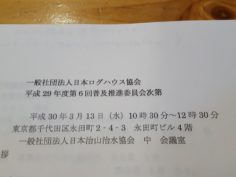 ログハウス普及推進委員会ではログハウスの普及を広めるための活動報告、今後のどのようにしたらログハウスという建物を皆様に知ってもらうかを会議します。 私は昨年からログハウス関東支部の支部長となったため参加させていただくこととなりました。 今まではこのような活動の中に加わったりすることは恥ずかしながらなかったのですがいざ参加させていただき自分にも使命があると思うと責任感がでてきますね。 新参者ですがお役にたてるよう頑張らさせていただきます。