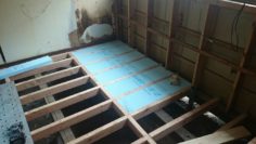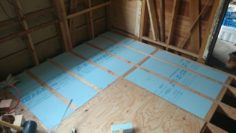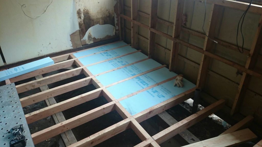 K様邸キッチンリフォームは、滝沢君の作業も進んでいますよ!根太組も終わり断熱材を敷き詰めて捨て貼りまで終わっています。今日はサッシを交換して外壁の段取りをしていましたね(^-^)