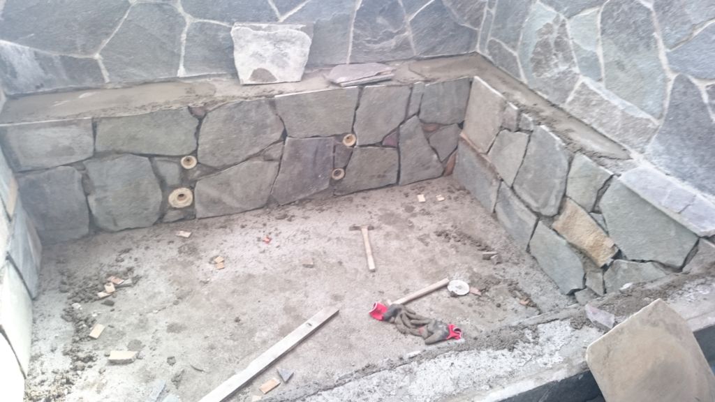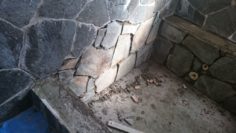 A様保養所リフォームでは、浴場に石を貼り込んでいます。熟練された職人さんが貼ってますよ~