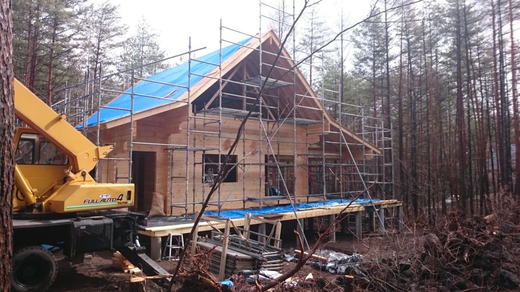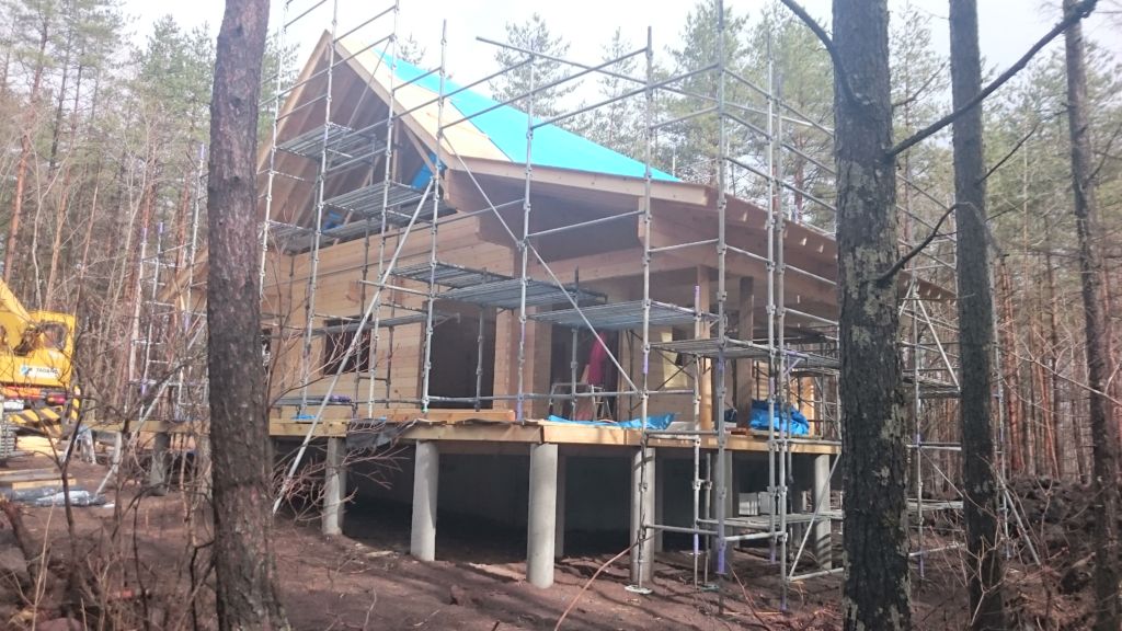 今回も少人数でしたが、早かったですね。月、火と土台やデッキや床の捨て貼り(床断熱)までを施工して水曜に人数を増やして一気にログを17段組上げ、木曜に2階の床、ログ積み、棟上げまでいきました!