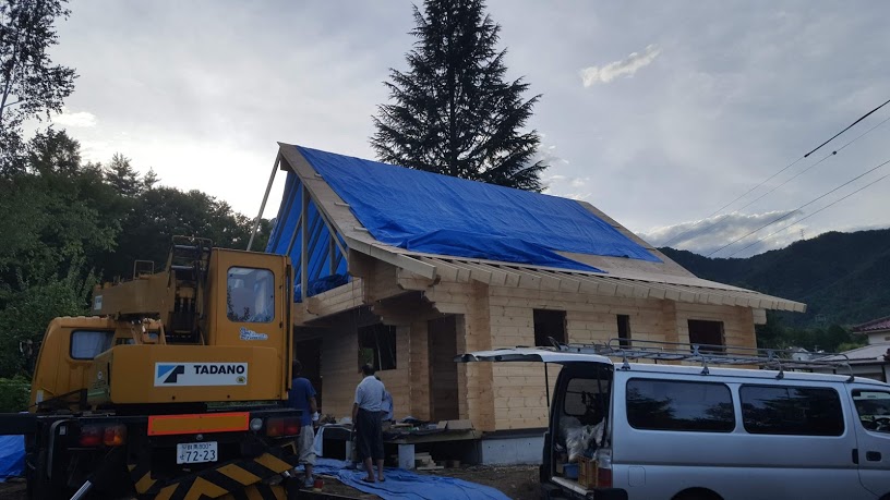 お仕事ですが安曇野市F邸様フィンランドログハウス建て方工事を進めています。 昨日も一昨日に続きかなり暑い日となりました。 私は弟のマーモンがお休みだったため久々に現場出動させていただきましたよ。 仕事内容は金物取付仕事です。 棟木部分のプレート金物取付、ログと垂木部分のL金物と取り付けました。 普段ランニングして体動かしているので現場も大丈夫!と思っていたのですが朝起きたら体中の筋肉がいたくてしばらく布団からでれなかったですね。 力仕事はやっぱり大変だなと再認識しましたね。 いつも頑張ってくれている職人さんに感謝です!  金物を取り付け、天窓の下地工事もおわり野地板施工の段階にすすみました。