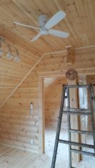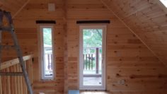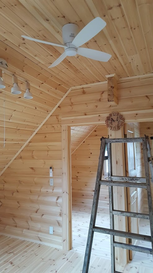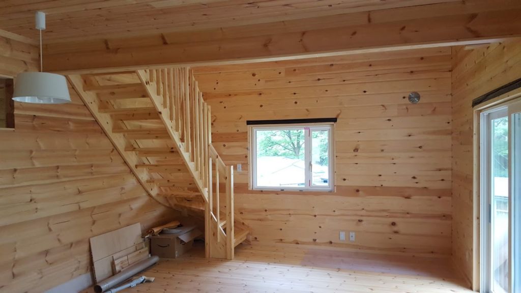 室内窓回りの造作以外はほとんど終わっておりまして外観のカラーリングも素敵に塗装されていました。 K様のご希望でログ材はフィンランドパインの無垢95㎜厚を使用しています。 無垢なんですが反りや割れも少なくいい雰囲気です。