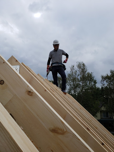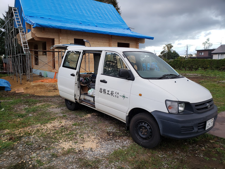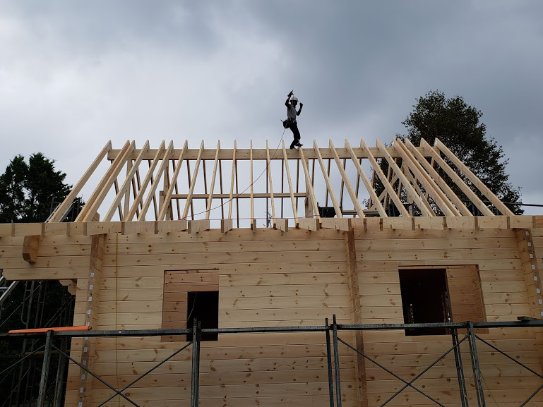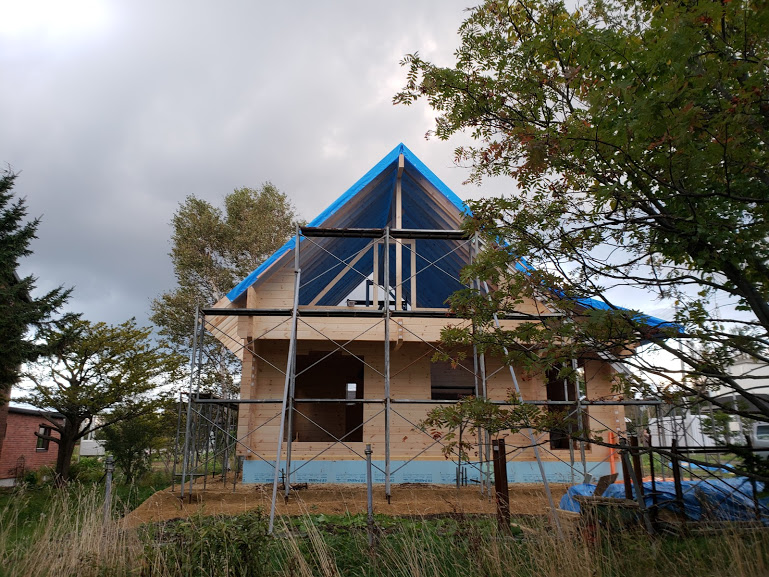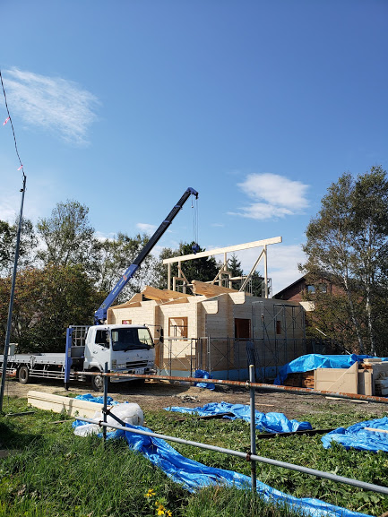 さてお仕事ですが北海道長沼町O邸様ログハウス建て方工事3日目! 無事棟上げになり屋根垂木もかかりました。