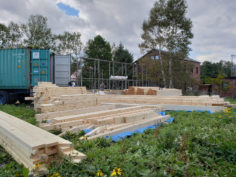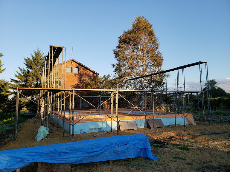 本日ステージ工事もこなしログ壁4段積み上げました。 明日も頑張りますよ!