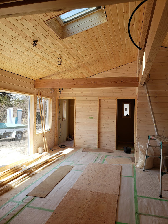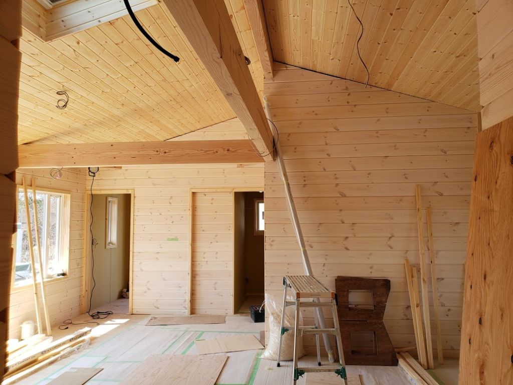 昨日はスキャンDホーム軽井沢!D邸様の現場に行ってきました。 内装にはログハウスの間仕切りで使用するログパネルをリビング・ダイニング部分に施工しました。 幅広い板がいい空間をつくりだしますね! しかも厚みが20mmありますので断熱性能も高いです。 海外から塗装されている板を使用していますので実の部分にもしっかり塗られているんですよ!!  北欧感たっぷりのスキャンDホーム! 完成はもう少しです!!