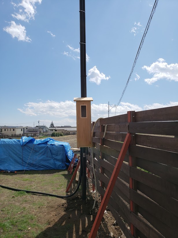 一昨日は電気の引き込みのために引き込みポールとたてて駒場大工さんにつくってもらった電気ボックスを取り付けました! 引込幹線は高橋設備さんが外回り掘るときに一緒に埋設してまらいま~す!!