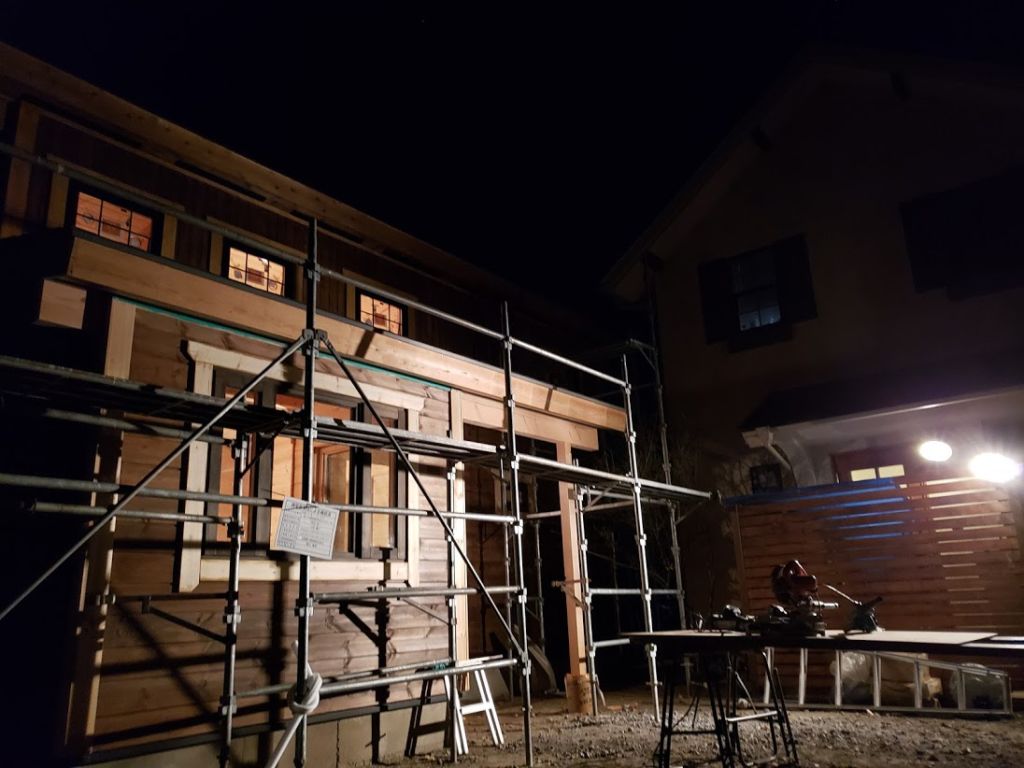 さてさてお仕事ですが前置きでかかせていただきましたがY美容室様3月後半オープン目途に急ピッチで工事進めております。 私もマサヤ君のお手伝いとして外回りの額縁工事と軒裏換気口の取り付けに行きましたよ! 外に作業場をつくりおしぎり丸ノコで額縁寸法に切りまして、塗装担当のY様に塗ってもらっている間に軒裏換気口の取り付けといった作業でマサヤ君と夜7時まで兄弟コンビで頑張りましたよ!!