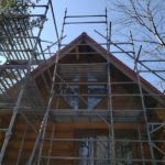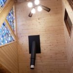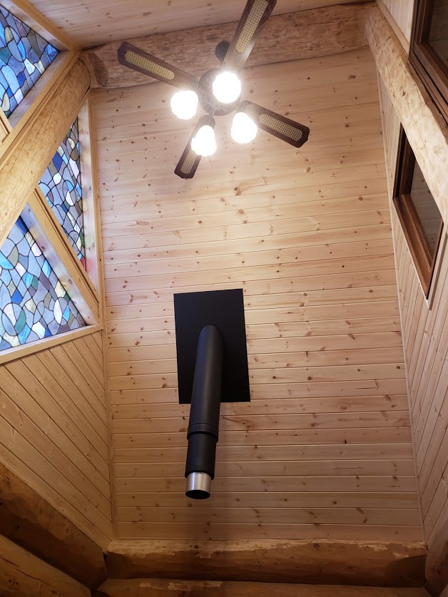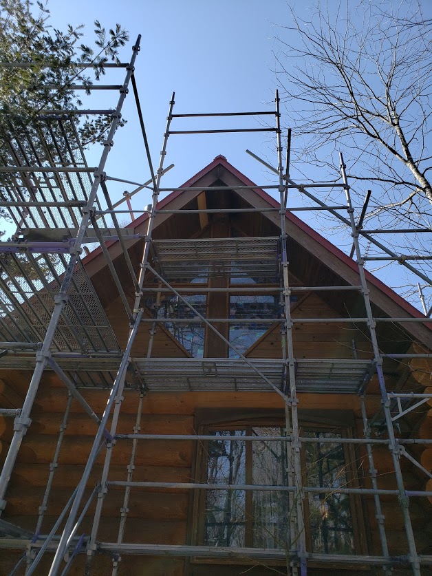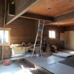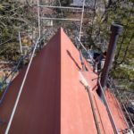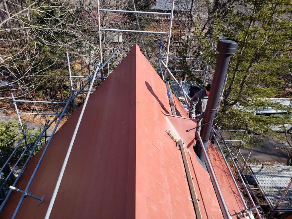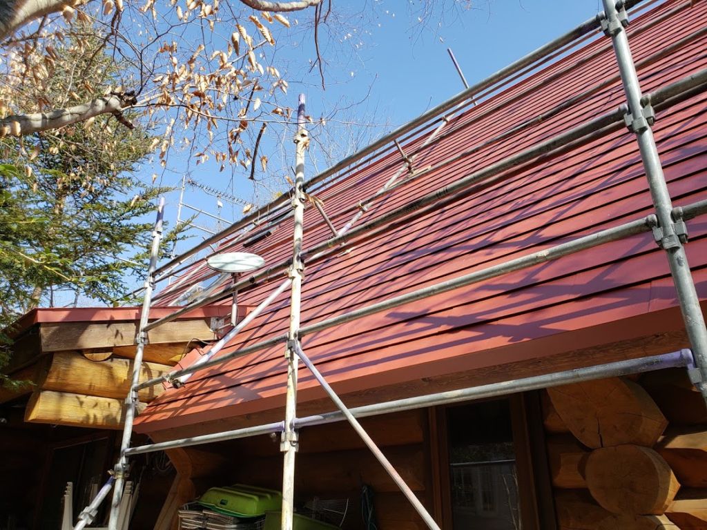 さて昨日のお仕事ですが、昨年から工事していまして雪の影響等で工事ができていなかったプリンスランドS邸様の屋根葺き替え工事が葺き終えました。勾配もきつかったのでかなり難しい工事だったと思いますが屋根屋の西山さんの職人技で綺麗に施工できました!! 西山さんいつも忙しいのに弊社の工事を快くしていただき感謝感謝です。 いつもありがとうございます。 屋根の葺き替え終わったので昨日は長野総商のやっちゃんが煙突施工。 室内も幕板をはめ込み屋根廻りの工事は完了です!! ようやく足場も解体できますので解体後に浄化槽の入替工事! 今度はクリーン設備さんに頑張ってもらいましょう~!!