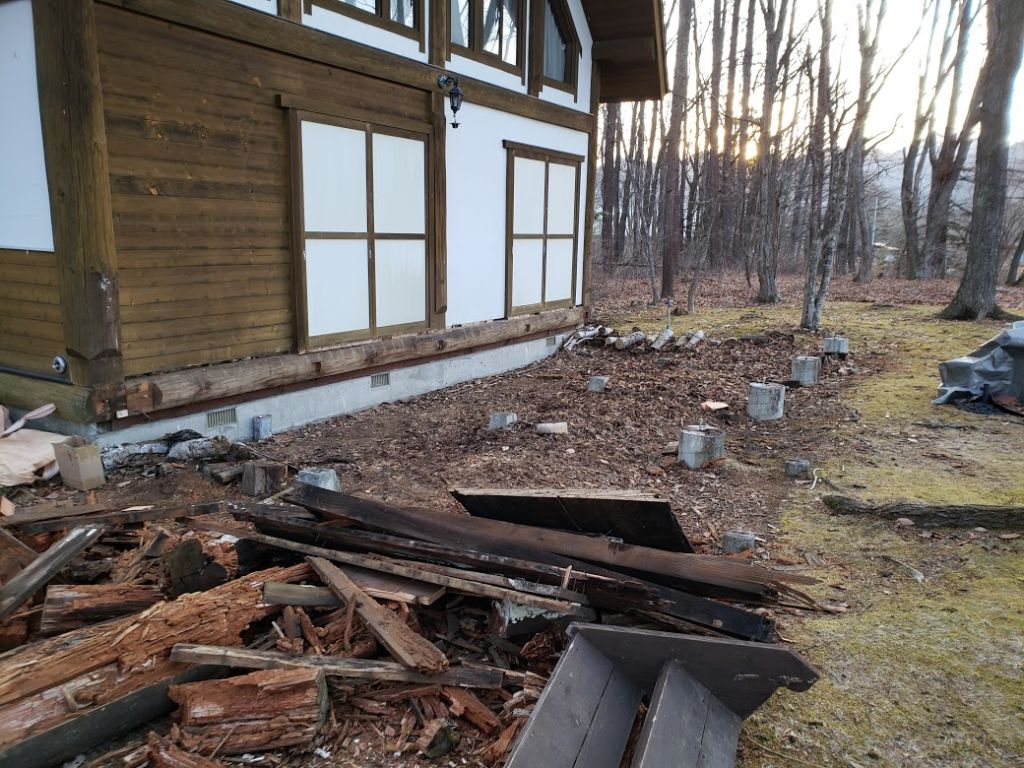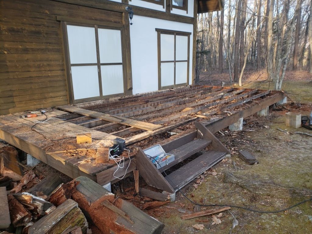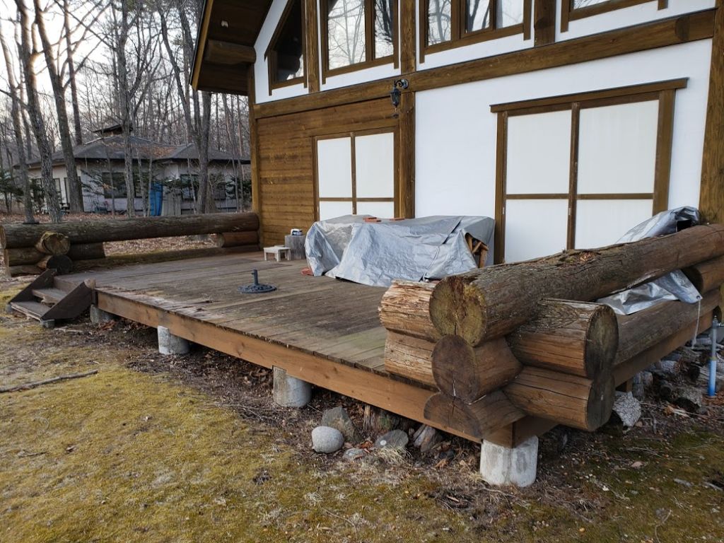 浅間高原エリアではリフォーム・リノベーションの「すみえーる」仕事でデッキ改修工事にとりかかっています! 「丸太の手摺で!!」というお客様の要望で工務店さんからお仕事依頼うけました! 昨日で解体工事は完了! 今日から大工工事にとりかかります!!