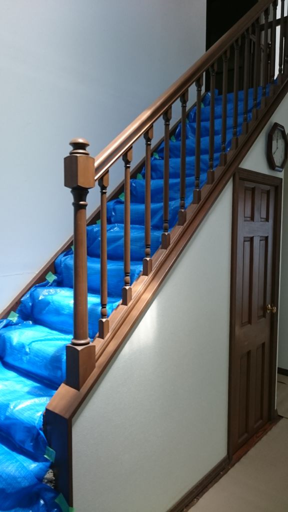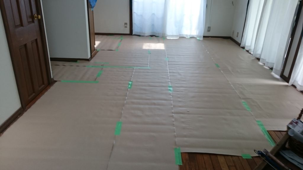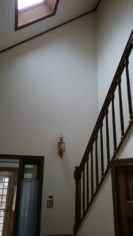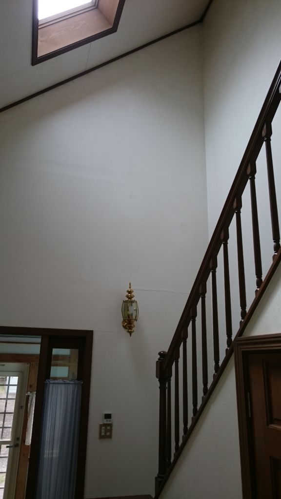 本日から着工になりました、嬬恋村別荘地内O様邸ではクロスの貼替をメインにちょっとしたリフォームです!リビングが吹き抜けていて、足場を組まないと作業ができないため、荷物の移動、養生をしてきました。