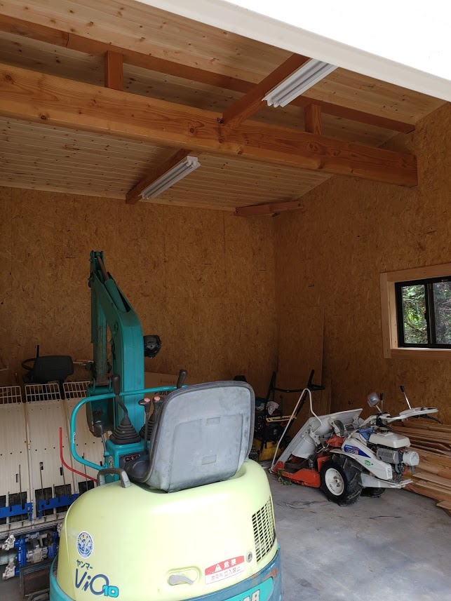 車庫は在来建築にて建築させていただきました。 ウッド調のサイディング、室内はOBS合板と天井は板で施工されいい倉庫となりましたね。