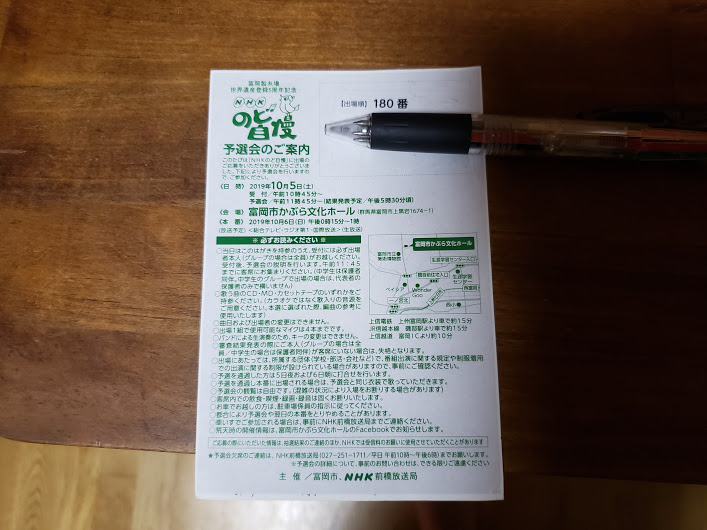 そうそう、以前NHKの「のど自慢」にでたいとブログに書いたことありますが今年の群馬大会に応募したところ予選会の切符を手にしましたよ!! まさか来るとは思ってなかったので嬉しかったですね~!!