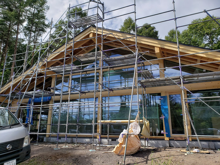 昨日撮った建物外観写真。 軒裏が一部貼られて大分形となってきましたね。 正面からみると迫力あるし格好いいですね! 北欧のポスト&ビームでは大きなFIXガラスを入れられます。 正面の部分2枚大きなガラスはトリプルガラスで巾が3500㎜、高さが2200㎜の大きなガラスです。 一枚450㎏!! ふ~、よく入れられたな~とホッと一安心していますよ!