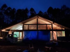 さてお仕事ですがVillaホテルのB棟の足場が昨日解体されました。 B棟は一番最初に建て方を始めた現場でして建て方の際にはまだ海外からガラスが納品できていなかったので建物内にガラスを吊り込むことができず足場解体してから外から入れる段取りとなっていました。 なので一足早くガラスを入れる段取りするため足場解体したわけです。 暗くなってから写真とってみました。 いい雰囲気ですね~。 足場解体すると完成にグッと近づく感じで少し気持ちが楽になりますね、っといってもまだまだ作業内容が濃いので心のギアを切り替えてまだまだ頑張りますよ!!