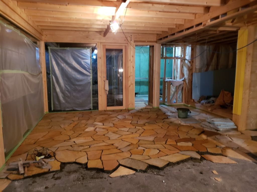 C棟では黒岩官業さんがアルビノミックス乱形石を貼り込んでいます。同じ形ではない石をパズルのようにはめこむ技術は職人魂感じますね! いい感じで仕上がりそうですよ!