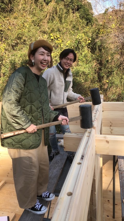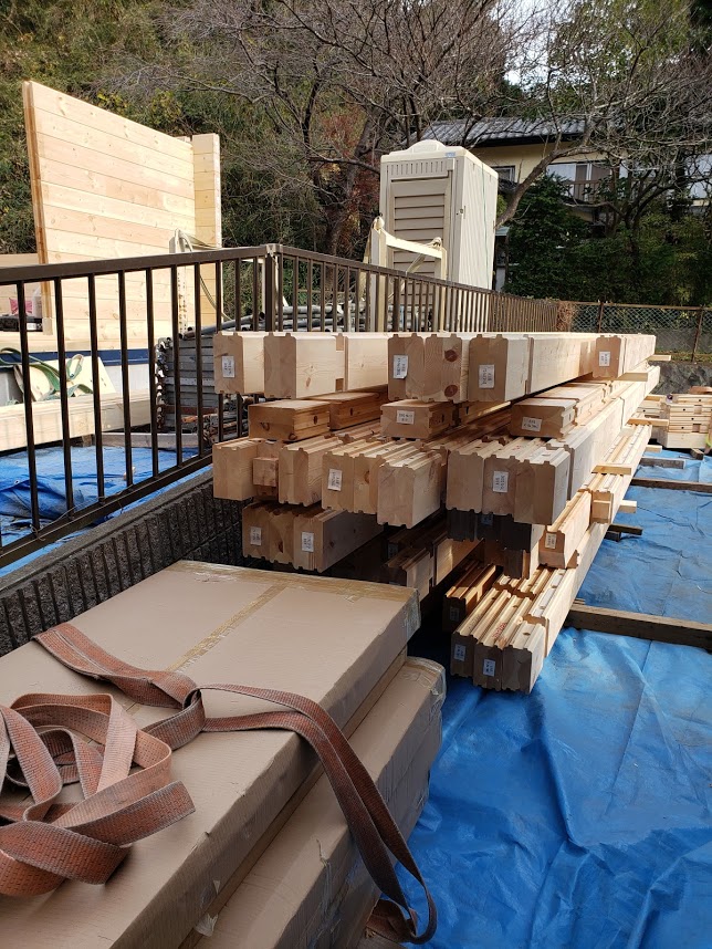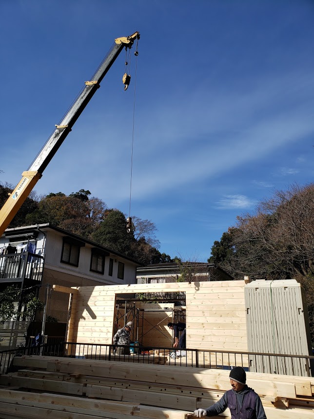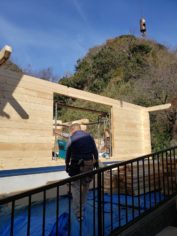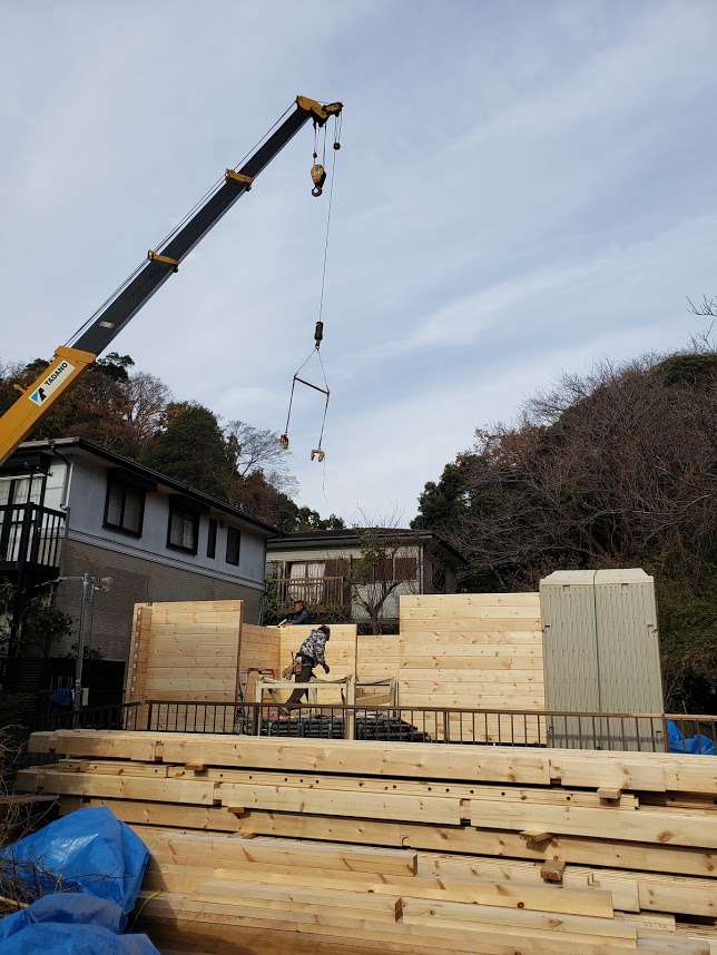こんにちは野口展孝です。 鎌倉市にてN邸様ロゴハウス建て方工事出張3日目になりますよ。 おかげ様、おかげ様のいい天気で建て方工事は順調に進んでおります。