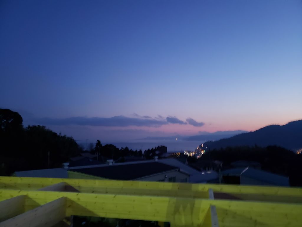 弊社シベリアパインログハウスはコストパフォーマンスが高いこと!!+加工精度が高いんですよ! 仕事終わりにログ壁17段目付近から写真とりました。 いや~いい雰囲気です。