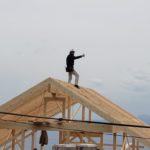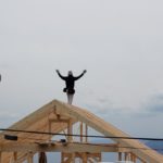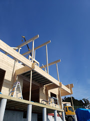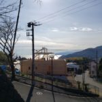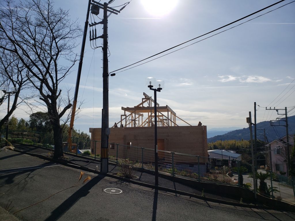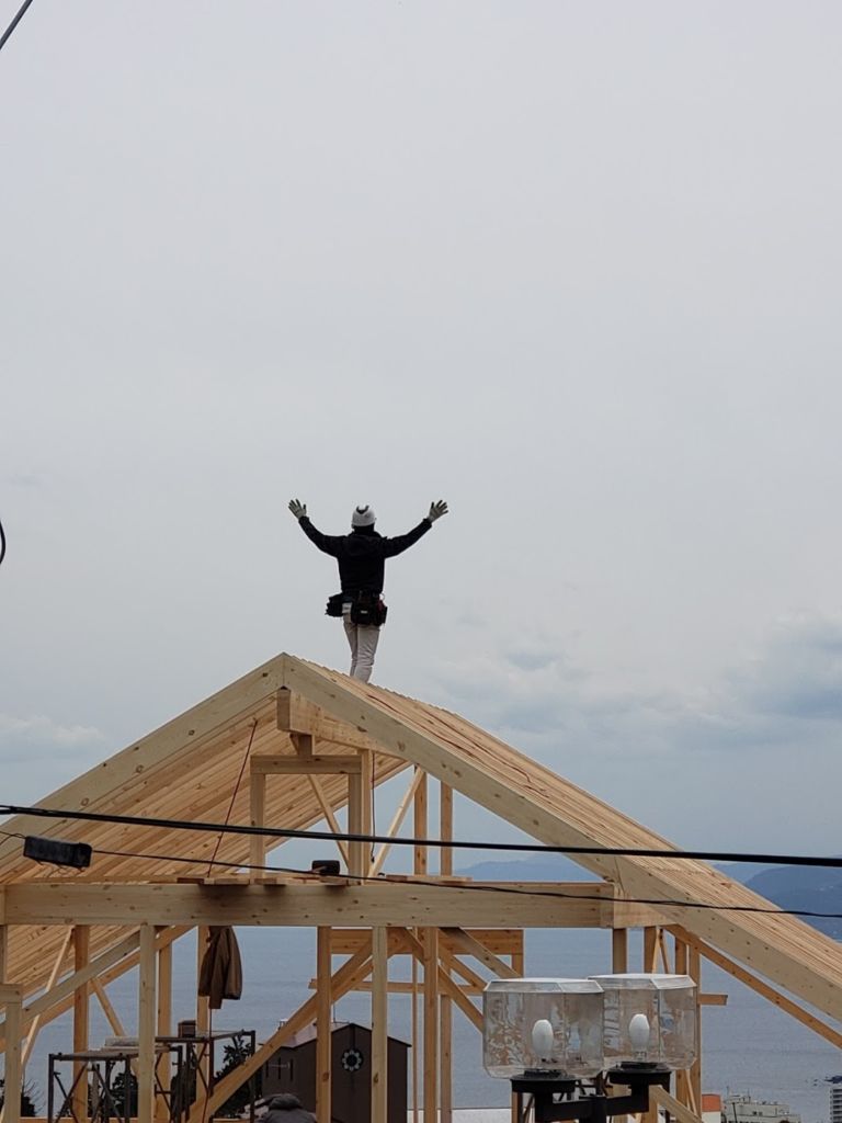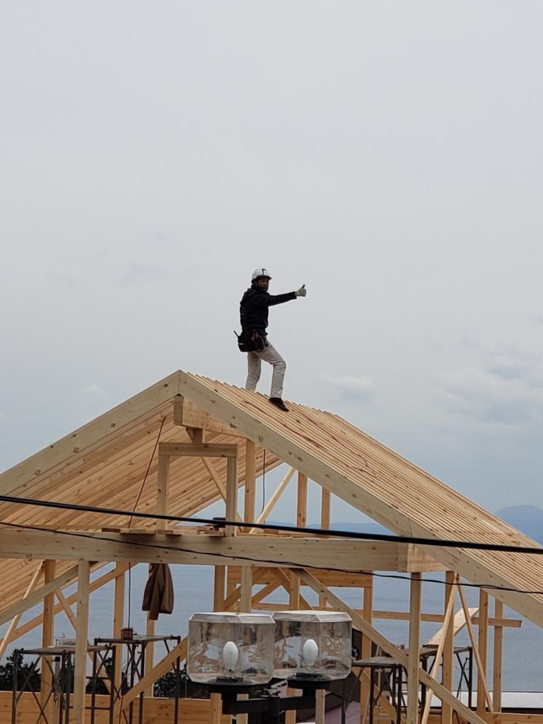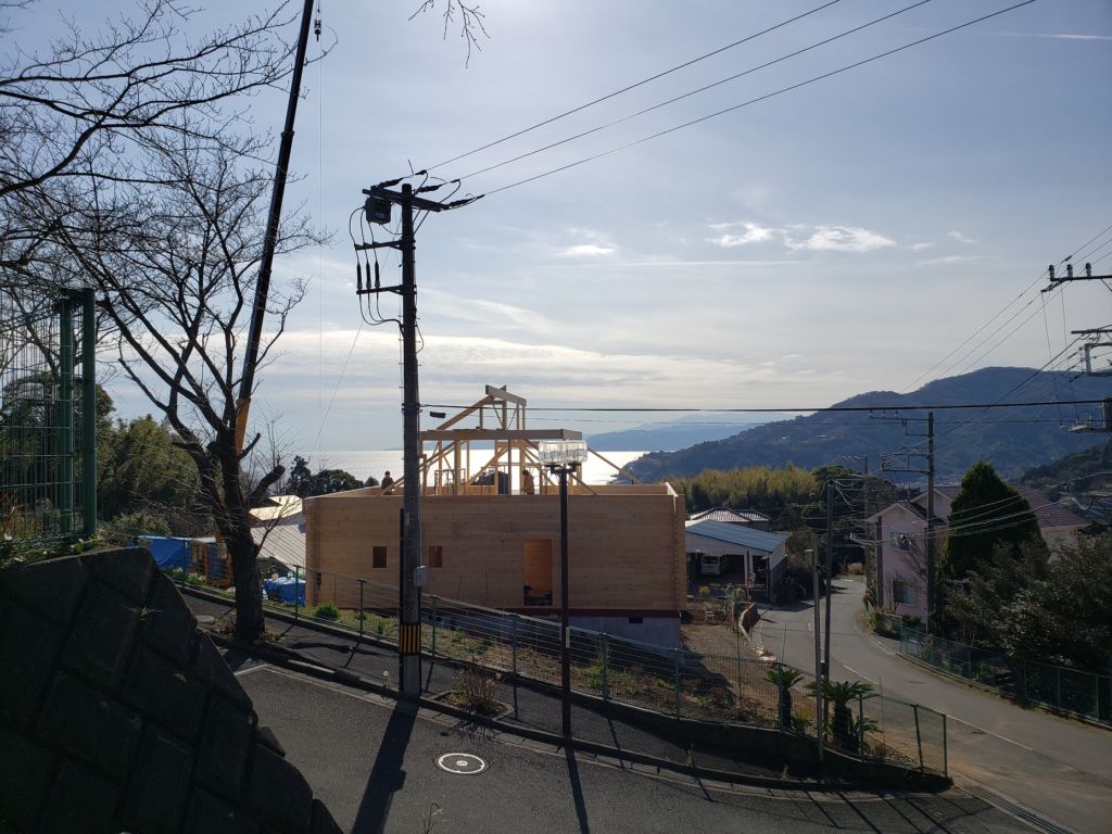 さてお仕事ですが湯河原町A邸様ログハウス建て方工事は5日目。 昨日ログ組みが完了しまして今日は小屋組み作業に入りました。 中国加工ログハウスは2Fの柱長さがカットされていたり、ホゾが加工してますのでかなり小屋組み作業の時間短縮ができます。 柱を立てて、母屋棟木をかけて、本日垂木作業が完了しました! 垂木かかったら私の出番! 棟の上で金物加工が楽しみ! 今日は海をみながら気持ちよく作業させていただきましたよ。