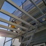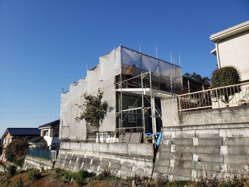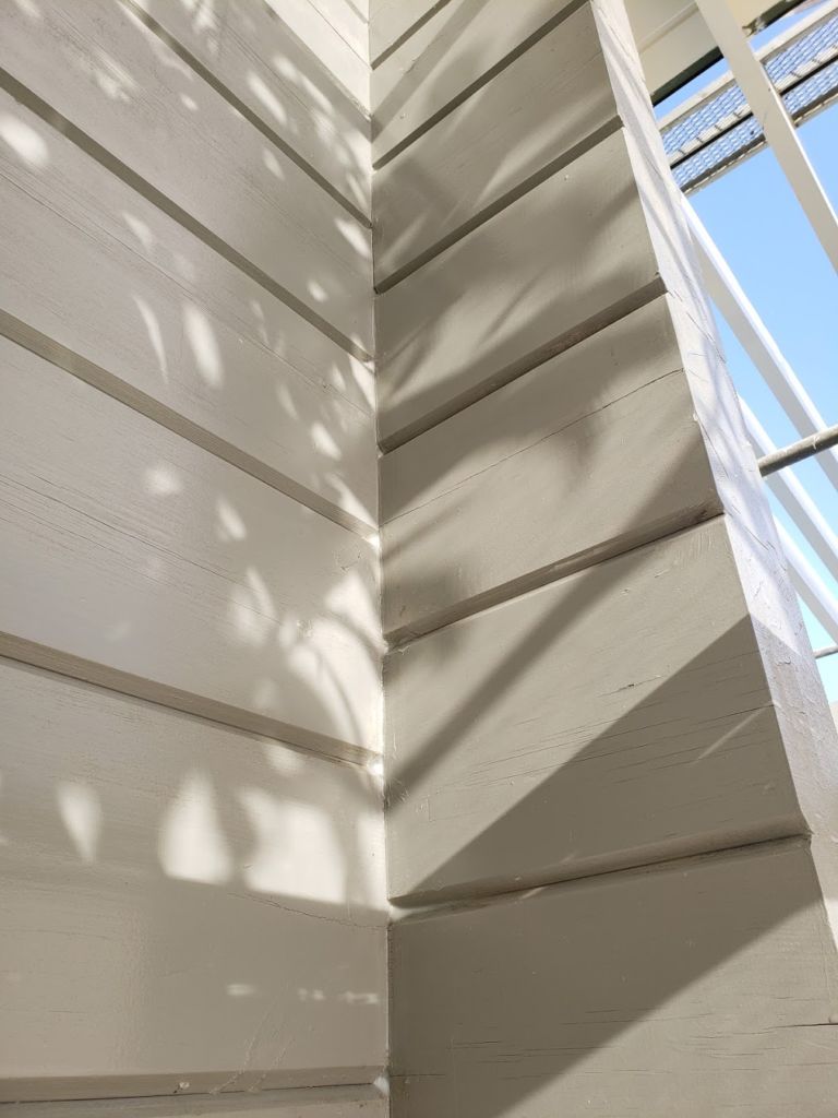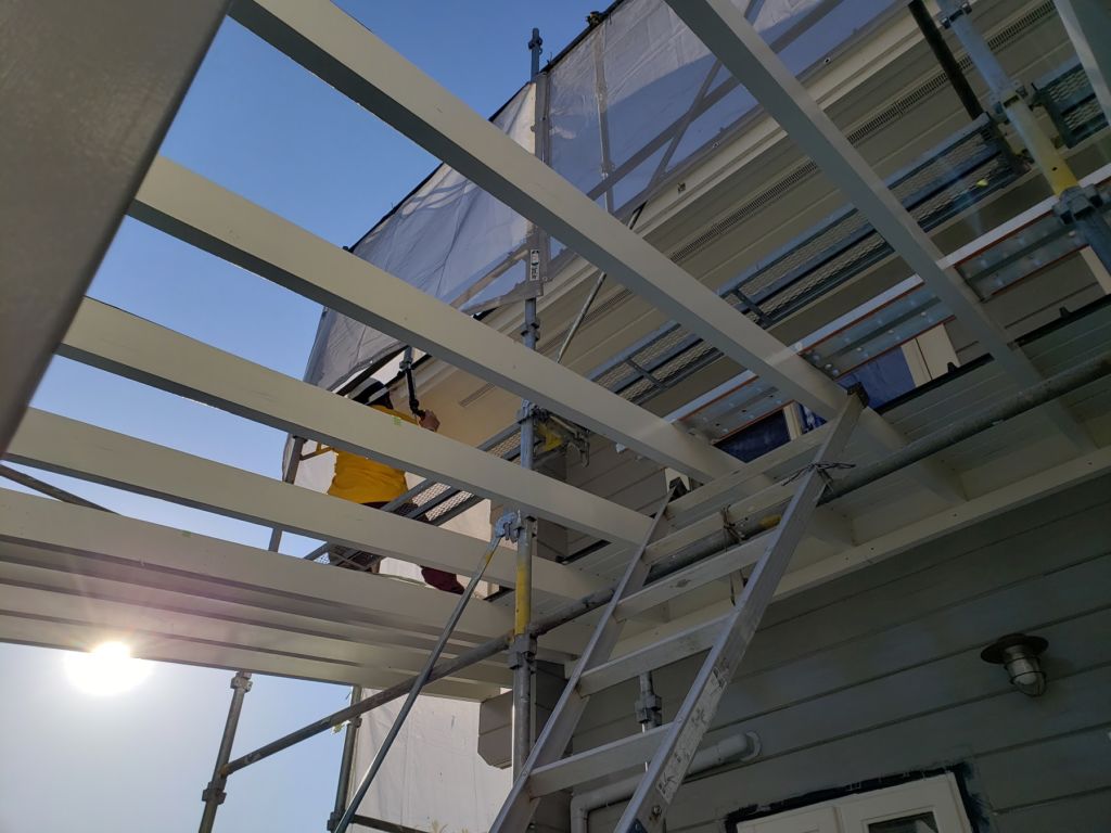 さてお仕事ですが、8年間に建築したT様邸にてメンテナンスのお手伝い。 中国ラミネートログハウスにて建築させていただきましてT様が足場を自分で手配してセルフペイントしました。 この塗装を機に全面コーキングしたいということでお手伝いに行ってきました。 アメリカのビックストレッチという水性コーキングで弾力性がありログハウスにピッタリのコーキングです。 クリアですのでほとんど目立ちません。 T様と二人でコーキングして午後2時に完了。 その他気になる部分もメンテナンスさせていただきました。 ペイントはキシラデコールのブルーグレイ4回塗り。T様頑張りましたよ!!