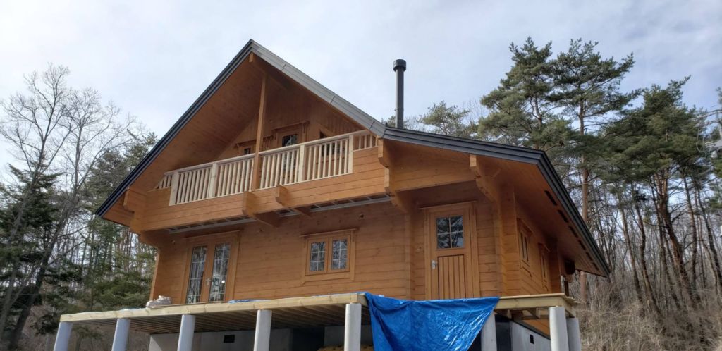 さてお仕事です。 御代田市F邸様の足場が解体されました。 弊社得意の折れ屋根スタイルのマシンカットログハウス。 約30坪の建物ですが高基礎ということもあって迫力ありますね。 外壁色はキシラデコールのピニー。 いい雰囲気です。 3月末完成にむけてスタッフ一同頑張ります。