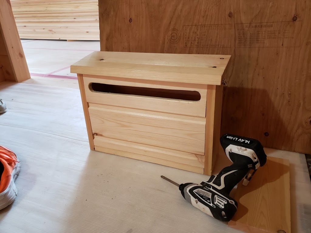宅配便も多くなったので仮設の郵便受けを余り木で作りました。